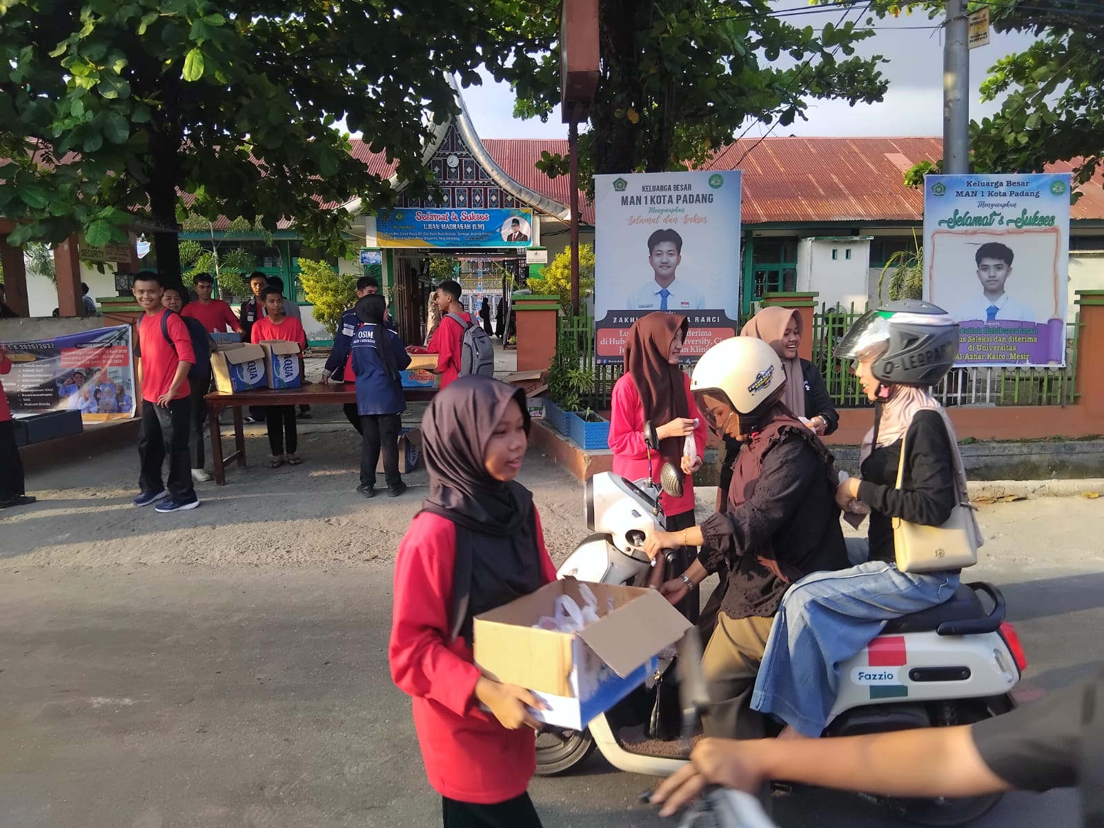 MAN 1 Kota Padang, Humas – Untuk menumbuhkan nilai peduli sosial di kalangan siswa, MAN 1 Kota Padang melalui Organisasi Siswa Intra Madrasah (OSIM) mengadakan kegiatan berbagi makanan takjil berbuka puasa.